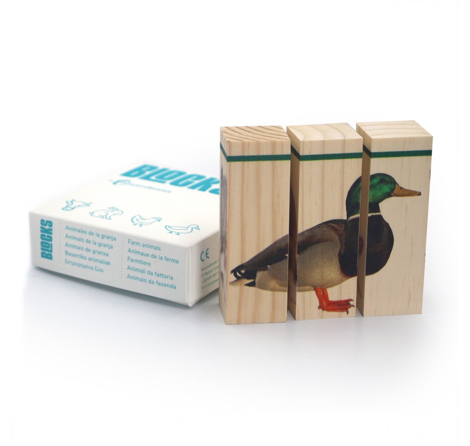 Estes blocos de madeira natural, com impressão de fotografias reais de animais da quinta, são a delícia dos mais pequenos.
