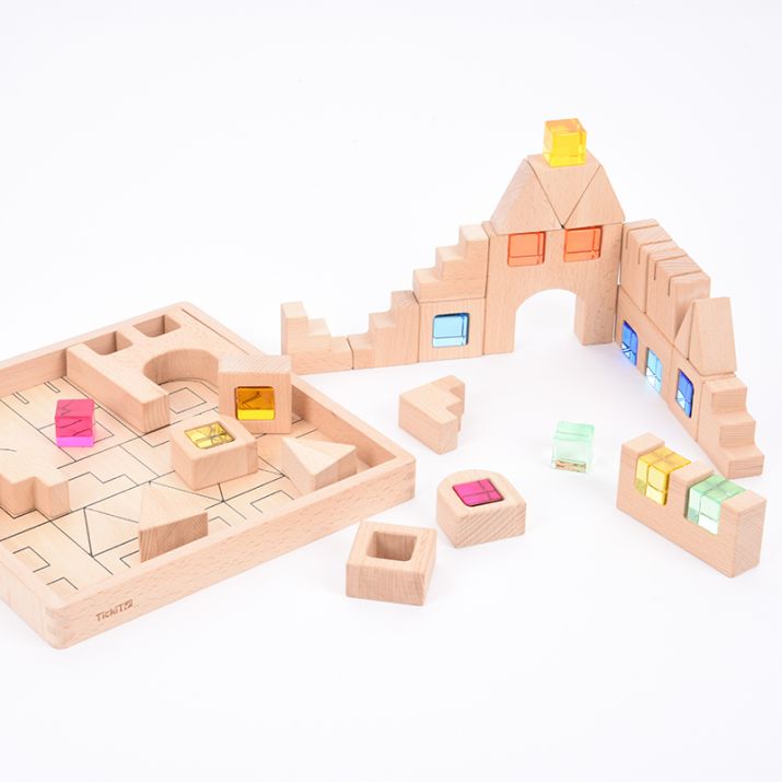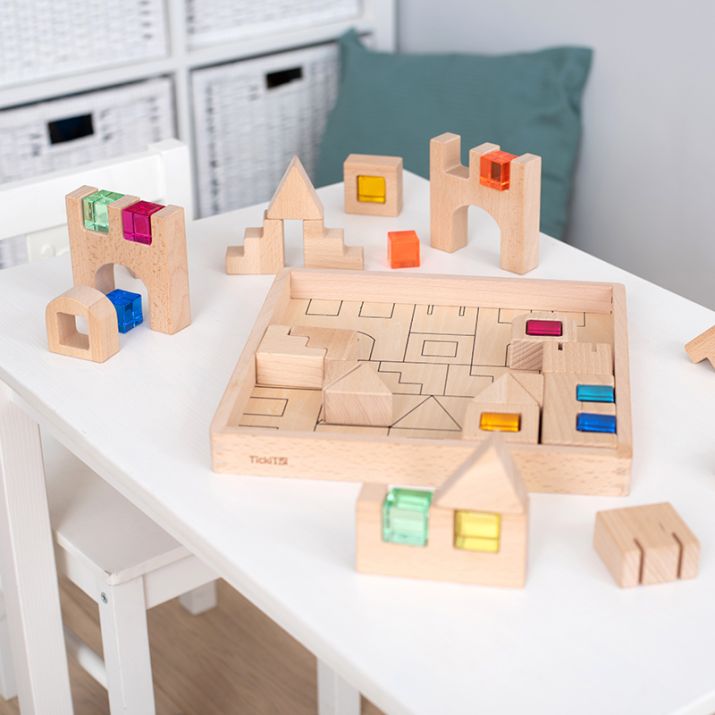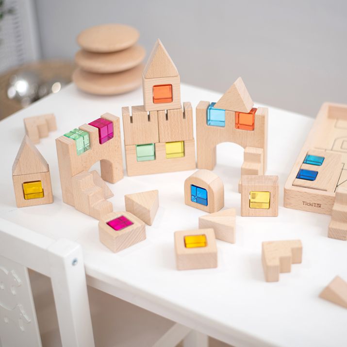 Conjunto de construção com 25 blocos de madeira e com 14 gemas de cores acrílicas, deTickiT.