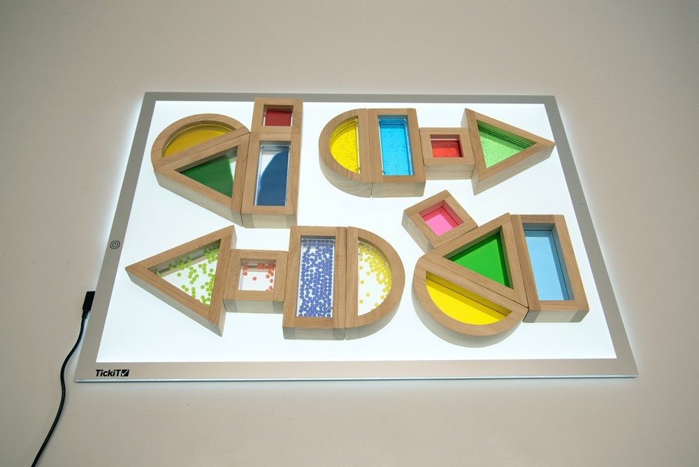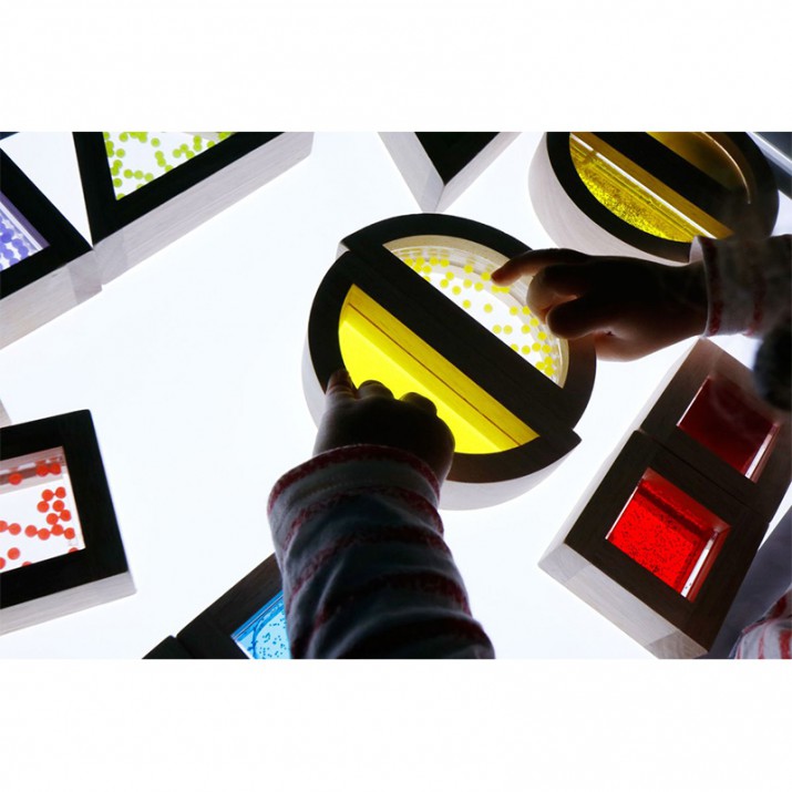 Conjunto de 16 blocos sensoriais de madeira, de diferentes formas geométricas com côr, areia colorida, água com purpurinas e bolinhas no interior.