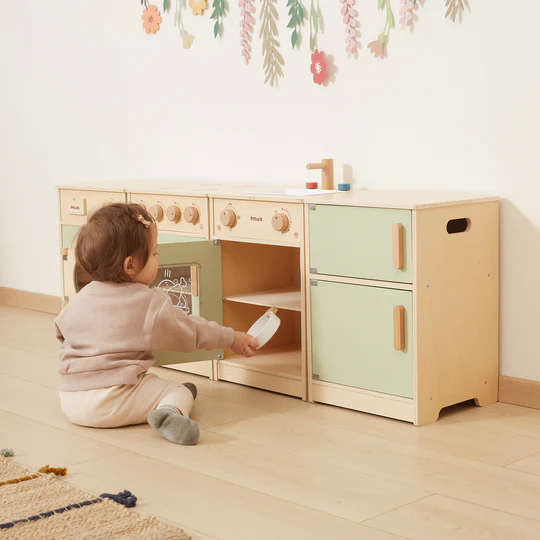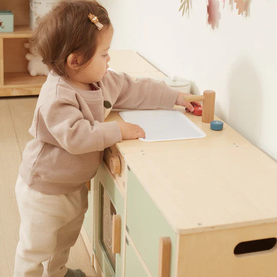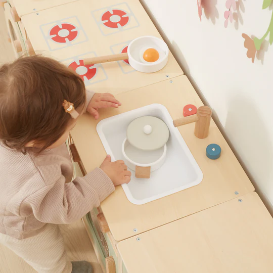 Com um design cuidadosamente trabalhado e detalhes realistas, esta cozinha em madeira oferece infinitas oportunidades para diversão, aprendizagem e exploração criativa.