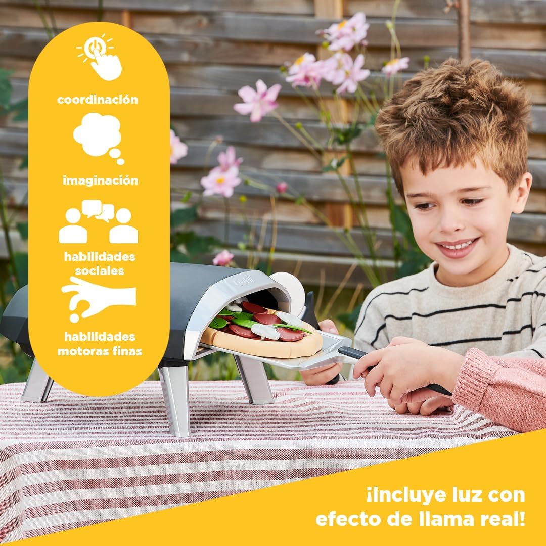 O forno acende com uma luz tremeluzente, imitando a chama real de um forno a gás. A criança pode colocar e tirar as pizzas com a pá, decorar com os seus ingredientes preferidos e até cortar as fatias com a roda de corte.