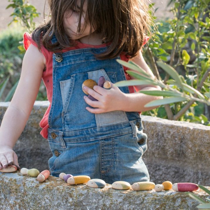 Conjunto de 18 insetos de madeira formado por joaninhas, lesmas e formigas, de cores arco-íris e pastel, da marca Grapat.