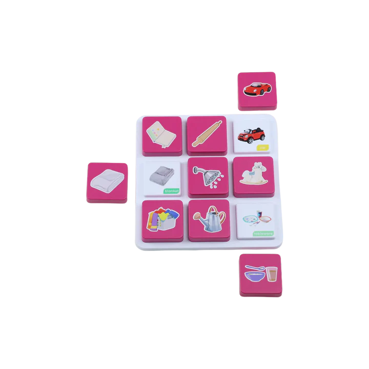 Com três tabuleiros temáticos que representam o quarto, a cozinha, a casa de banho e a sala, este jogo incentiva o reconhecimento dos espaços e objetos do quotidiano, reforçando o sentido de organização e pertença.