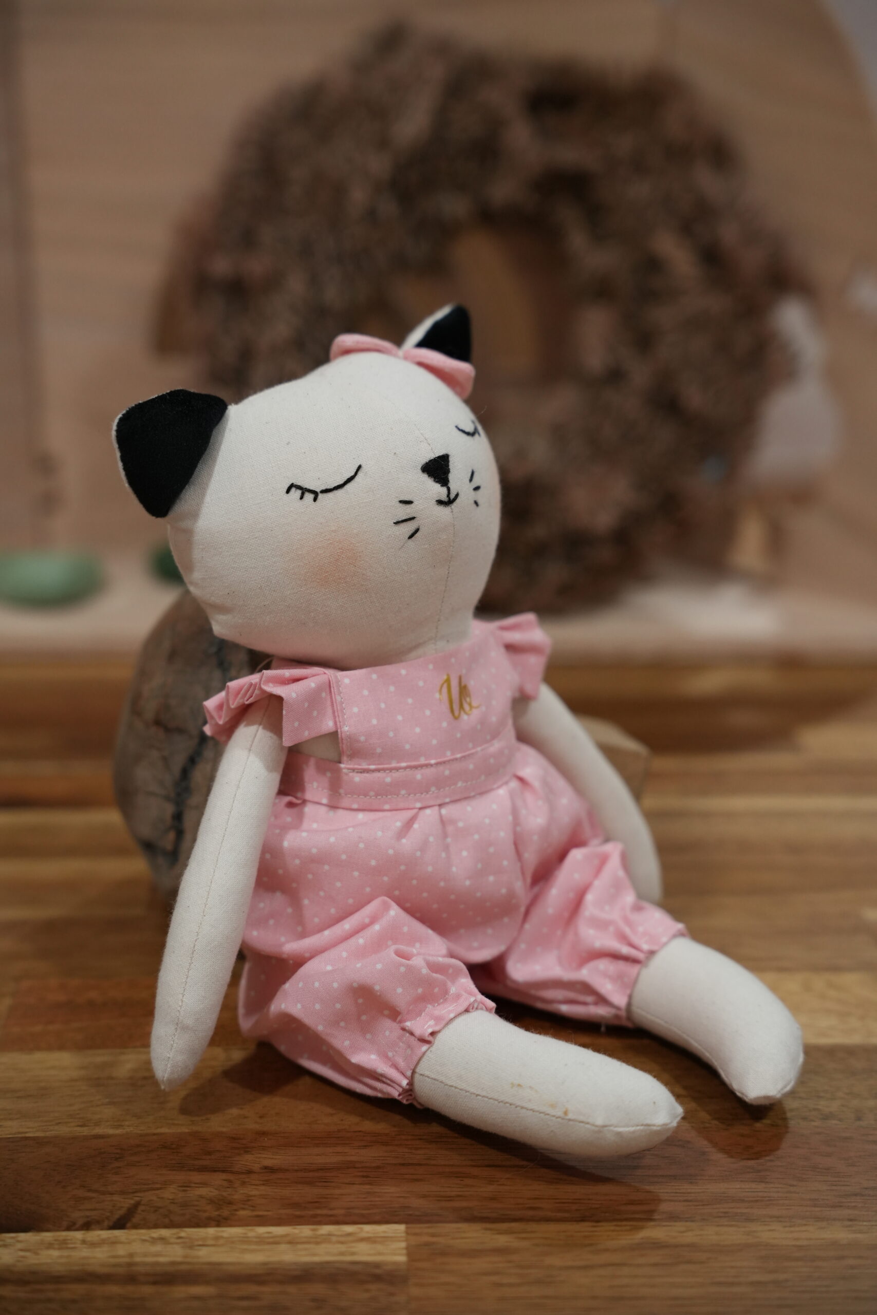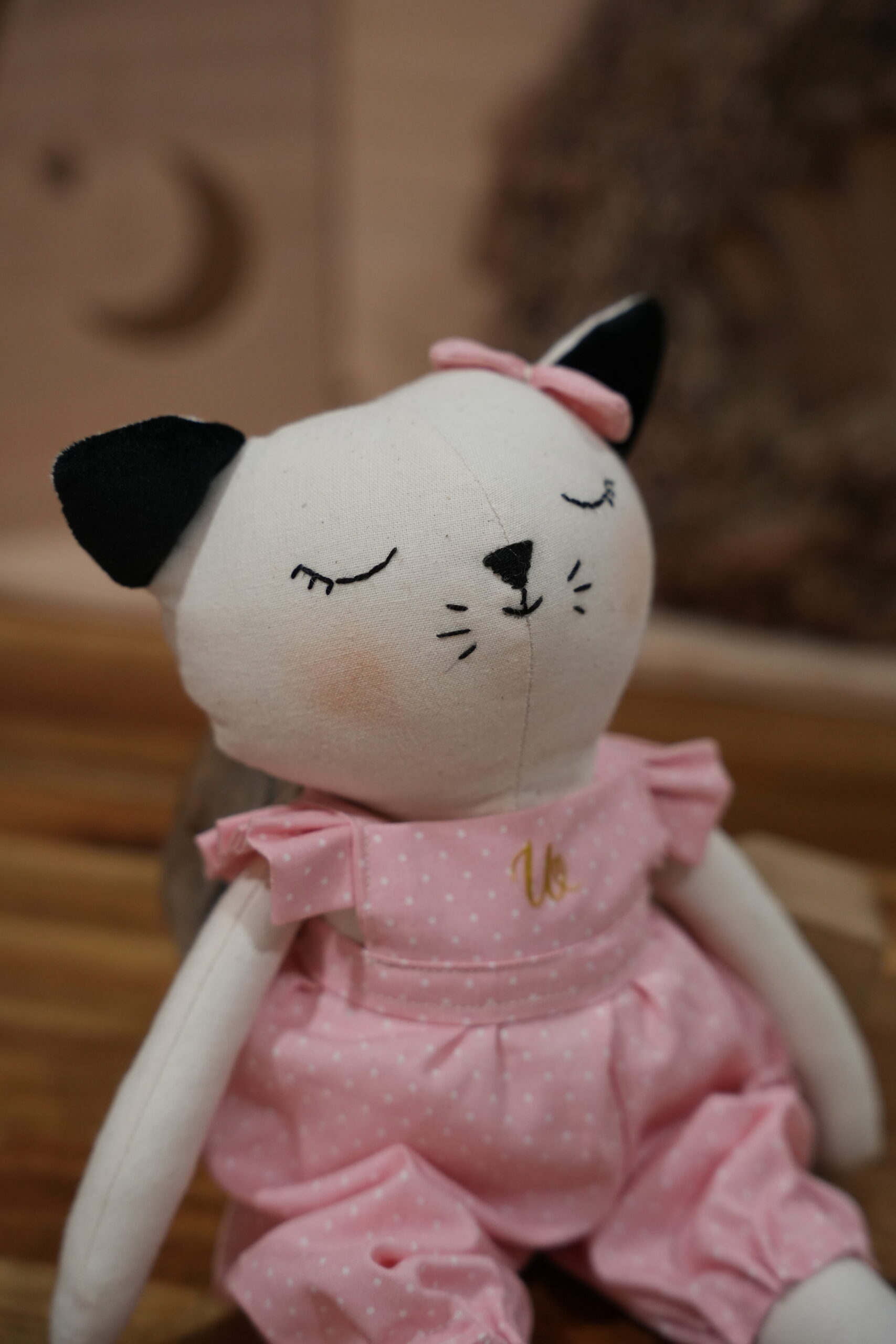 Esta doce gata artesanal foi feita à mão em Portugal, com materiais cuidadosamente escolhidos para oferecer suavidade, conforto e beleza. Confeccionada em tecido macio, apresenta um delicado macacão cor-de-rosa com padrão subtil, pensado para encantar crianças e adultos.