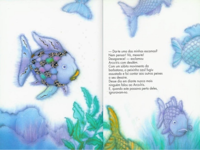 Porém, tudo mudou quando o peixe Arco-Íris negou insultuosamente uma das suas escamas cintilantes a um peixinho azul que, indignado, foi contar o sucedido aos seus amigos.