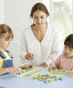 Conteúdo: guia didático, 24 cartões de atividades, 18 peças de madeira quadradas em 3 cores (com orifício), 18 peças cilíndricas de madeira em 3 cores, 2 suportes de madeira.